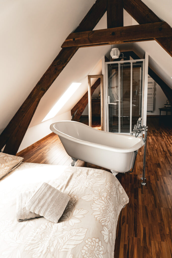 À l’extérieur, le gîte dispose d’un accès au jardin par escalier extérieur, offrant un espace supplémentaire pour profiter du calme et de la verdure du Domaine.