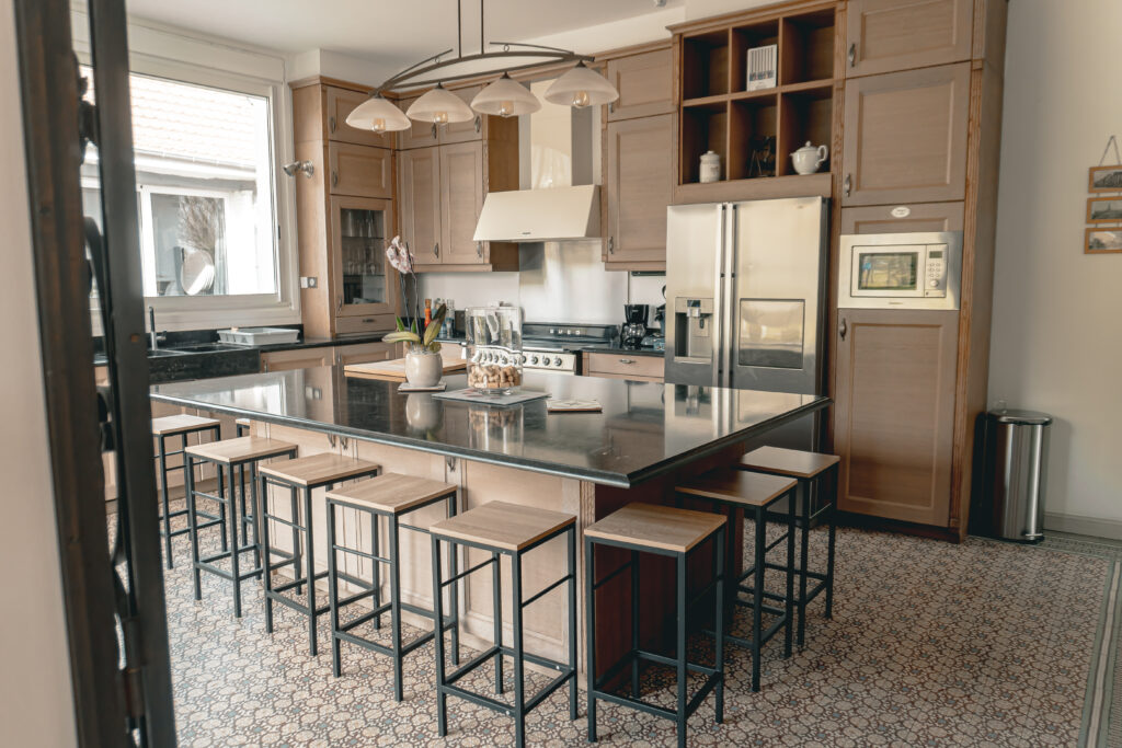 La cuisine, spacieuse et fonctionnelle, est équipée d’un grand îlot central, d’un lave-vaisselle, d’un réfrigérateur et d’un congélateur, permettant de cuisiner à plusieurs en toute simplicité.